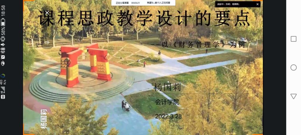 2022年3月28日晚上,由教学评估与教师教学发展中心主办,yl7703永利承办的本学期第一期教学沙龙活动在线上顺利开展。yl7703永利杨国莉教授主讲的教学沙龙主题是“课程思政教学设计的要点---以《财务管理学》为例”。yl7703永利、商公司、数统公司的50多名教师参加了本次活动。