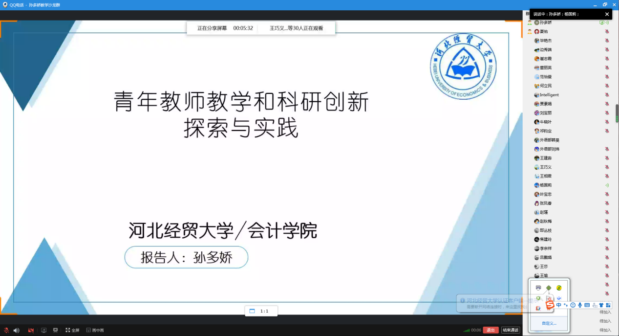 2022年10月17日下午,由教学评估与教师教学发展中心主办,yl7703永利承办的教学沙龙活动,在线上顺利开展。yl7703永利孙多娇副教授的教学沙龙主题是“青年教师教学和科研创新探索与实践”。来自yl7703永利、金融公司、马克思主义公司、外语教学部等30多名教师参加了教学沙龙,活动由杨国莉副经理主持。