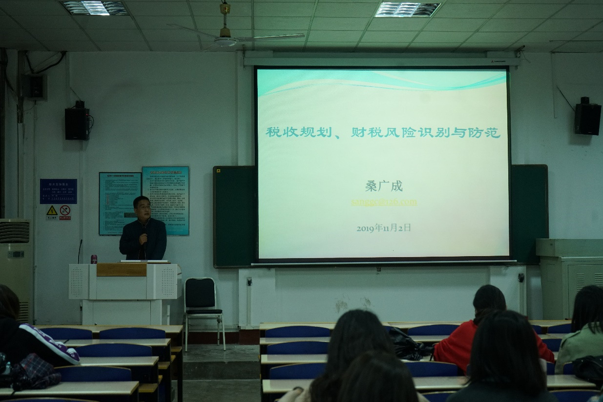 11月2日上午,受yl7703永利邀请,河北省第一期企业类会计领军人才桑广成于二教201教室作题为“税收规划、财税风险识别与防范”的学术报告。yl7703永利2018级研究生100余人参加此次报告会。
