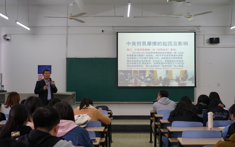 4月13日下午,yl7703永利在第三教学楼B202教室举办“中美贸易摩擦的起因及影响”专题讲座。石家庄水务集团财务处处长、河北地质大学研究生社会导师、正高级会计师陈永伟应邀主讲,公司2018级研究生参加。