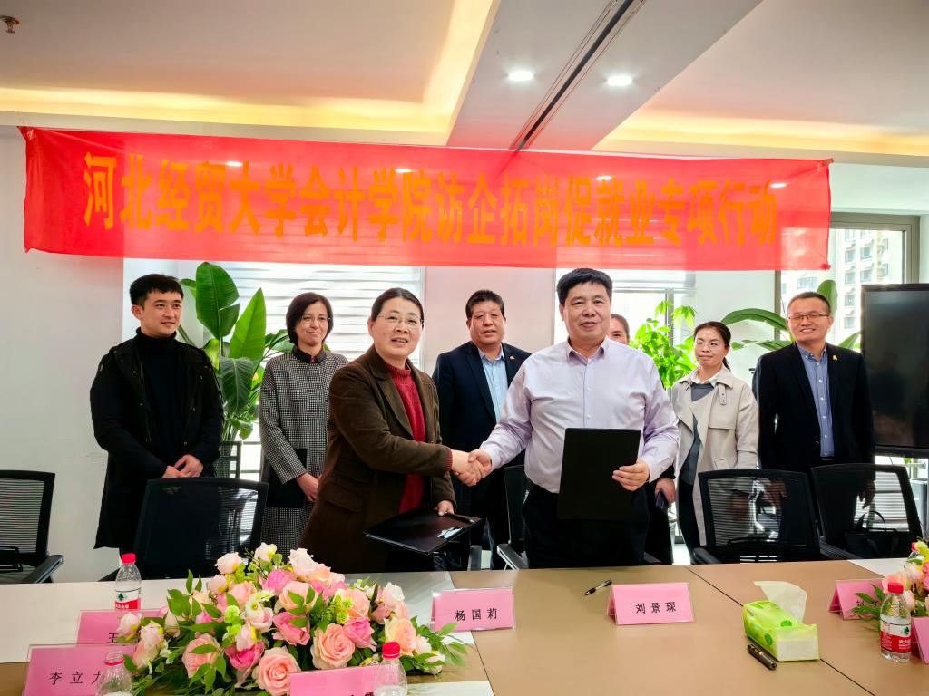 刘建平一行先后走访了用友·新道科技股份有限公司、美联盛航保险代理有限公司、臻顺溜科技股份有限公司、河北红日会计师事务所等四家企业。座谈会上,刘建平对各个企业高度重视校企合作、精准对接高校就业岗位、积极践行社会责任表示充分的肯定,并从公司的基本情况、新财经教育改革以及推进校企合作等方面进行了介绍。各企业纷纷表示希望与公司在产教融合、供需对接、创新成果应用等领域进一步加深合作,实现资源共享、优势互补、互利共赢。