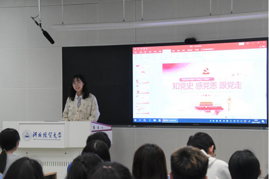 首先,冯子怡通过“限电”现象,剖析相关政策的深刻内涵,表现出我国高瞻远瞩的战略智慧,引入正题“知党史,感党恩,跟党走”。随后,她围绕三部分内容进行详细讲解。第一部分,坚定理想信念,时刻不忘知党史。冯子怡带领青马学员回顾了党的百年征程,党从革命中走来、从新中国建设中走来、从改革开放中走来、从为人民谋幸福中走来,从党的诞生到建党百年,在中国共产党的领导下,久经磨难的中华民族必将继续以坚定的信念、昂扬的姿态迈向社会主义现代化新征程。第二部分,补足精神之钙,时刻不忘感党恩。坚持全心全意为人民服务,是马克思主义政党永远奋斗的根本保证。冯子怡通过列举“时代楷模”张富清、“最美奋斗者”黄大年的事迹号召广大青年团干部学习他们时刻不忘跟党走、矢志创新、拼搏奋斗的精神。第三部分,践行初心使命,一心一意跟党走。冯子怡要求团员青年学懂弄通习近平新时代中国特色社会主义思想;旗帜鲜明讲政治,坚决做到“两个维护”,加强党性修养,党性锻炼。