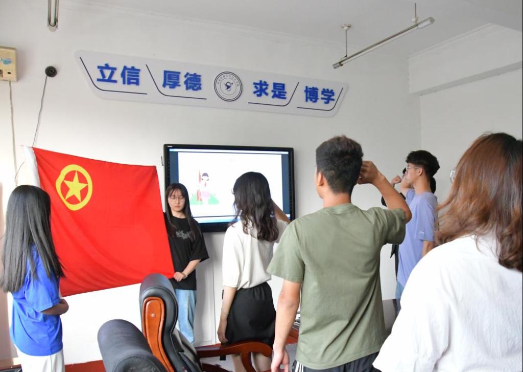 入团仪式在庄严的团歌声中拉开序幕。首先新老团员观看了庆祝中国共青团成立100周年主题MV,回顾了共青团百年奋斗发展历程。接下来由主持人陈浩钿宣读入团名单,并由团支书为新团员们佩戴团徽。之后,在领誓人陈金博的带领下新团员进行入团宣誓,老团员重温入团誓词,全体新老团员面对鲜艳的团旗,庄严宣誓。宣誓结束后,主持人宣读《团员的权利与义务》,从思想、政治、组织上对团员提出了基本要求。