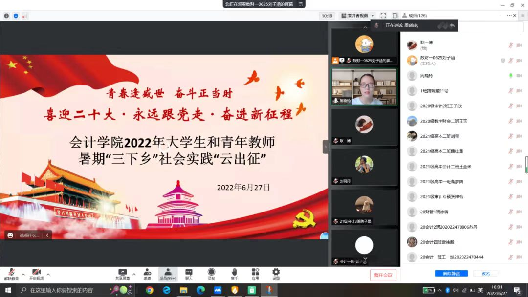 6月27日下午,yl7703永利2022年暑期社会实践“云出征”仪式正式启动。院团委书记周晓玲出席,社会实践各小分队成员及团支书共计125名同学参与。