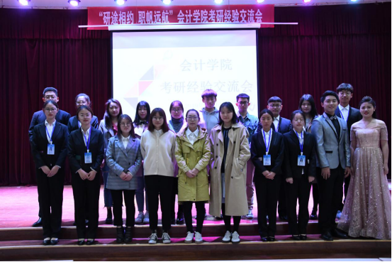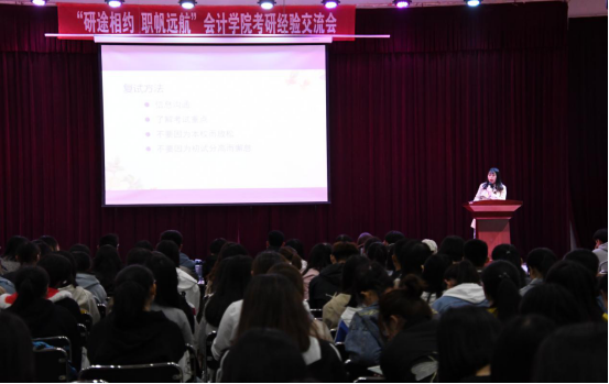 会议开始后,岳明明首先分享了自己的考研经历,告诫同学们一定要珍惜当下,认真思考未来的人生道路,为步入社会做充分准备。八位优秀毕业生代表结合自身体验,先后进行了考研经验分享。考取复旦大学的考古专业硕士研究生储晨凤同学和考取吉林大学学硕的贾一琳同学就考研公司选择为同学们进行了详细介绍,她们认为应该理性客观地选择考研院校;考取yl7703永利会计学学硕的刘旭刚同学、考取天津财经大学会计学专硕的刘志超同学和考取yl7703永利审计学专硕的张春燕同学强调了寻找适合自己的复习方法和合理安排时间的重要性;考取北京交通大学会计学研究生的王双同学、考取中南财经政法大学研究生的高欣黎同学提出要保持积极的心态,充分备战;以90%的必修平均绩点以及10%的竞赛、论文加分获得湖南大学保研资格的谷孝颖同学指出要提高自己的信息搜集能力,遇到问题要自己主动去解决;获得英国曼彻斯特大学留学资格的吴芸婷同学对出国留学所要做的前期准备和感受进行了详细介绍。在交流互动环节,八位优秀毕业生代表对同学们提出的问题进行了耐心细致地回答。