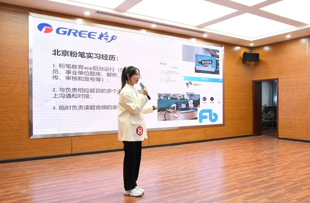 在风采展示环节中,选手们通过幻灯片展示了自己求职意向、职位认知、校内外实践和个人能力等。结构化面试环节,选手随机抽取结构化面试题组作答,展现出良好的职场认识能力、临场应变能力和人际关系协调能力。