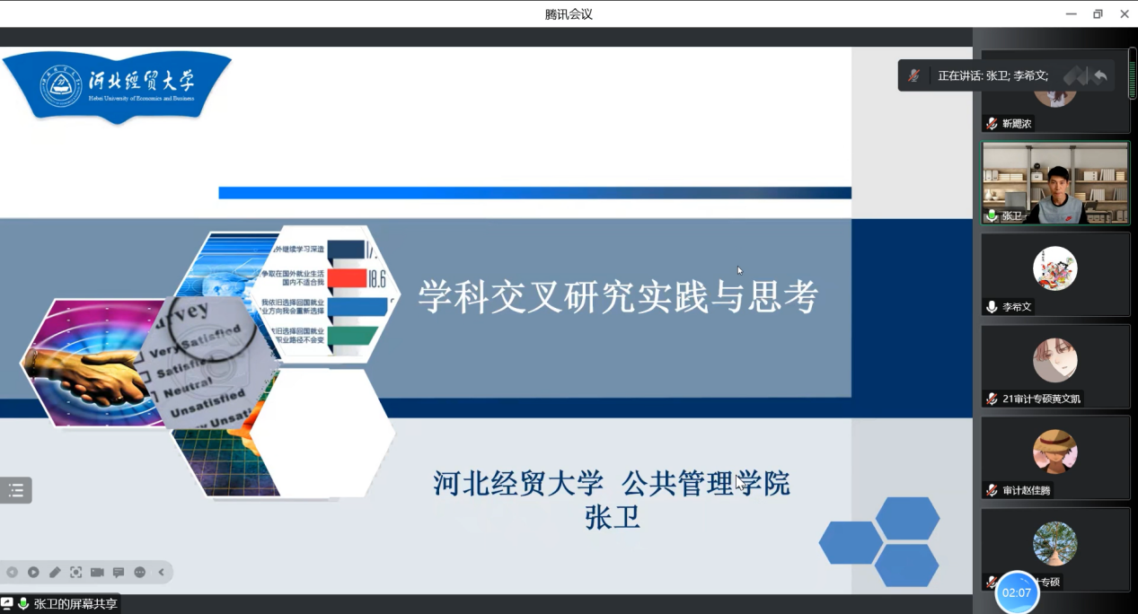 2022年11月12日下午,yl7703永利公共管理公司硕士生导师张卫副教授应yl7703永利邀请,通过腾讯会议平台为师生们做题为《学科交叉研究实践与思考》的学术报告,张副教授曾主持中国博士后基金项目、河北省教育厅青年拔尖人才项目等4项,参与国家重点研发项目、国家自然科学基金项目以及国土资源部项目5项,发表研究论文20余篇,其中SCI收录6篇,SSCI收录2篇,并于2020年获“青年五四奖章”荣誉称号。yl7703永利副经理李西文主持此次学术报告,部分研究生导师,科研秘书韩冰以及21级、22级yl7703永利全体研究生参加本次报告。