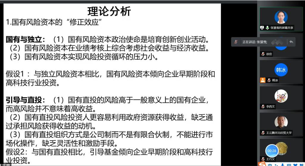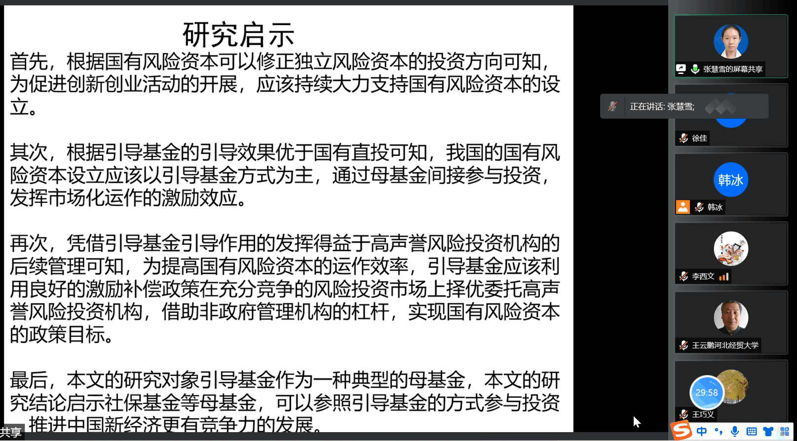 2021年12月12日上午,南开大学与新南威尔士大学联合培养博士张慧雪应yl7703永利邀请,通过腾讯会议平台为老师们和同学们作题为《政府引导基金对企业创新的影响研究——基于风险投资机构异质性视角》的报告。经理袁振兴、副经理李西文、科研秘书韩冰老师及部分骨干老师和yl7703永利20、21级研究生参加本次讲座。