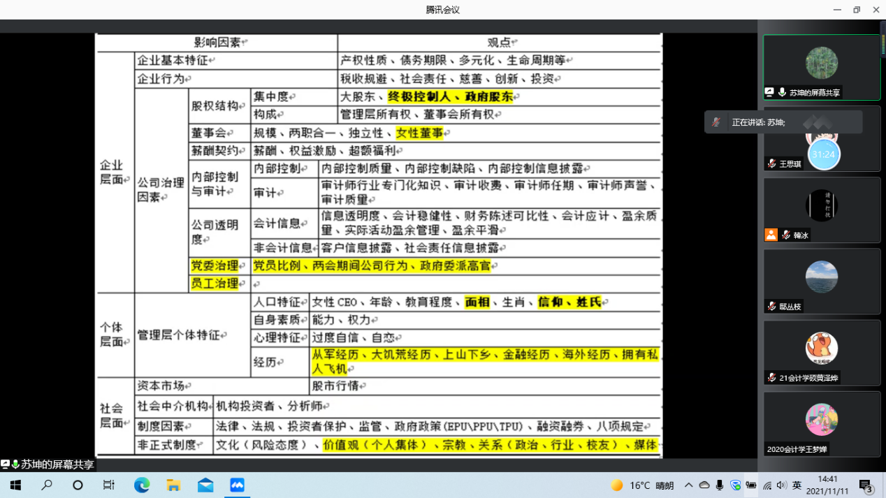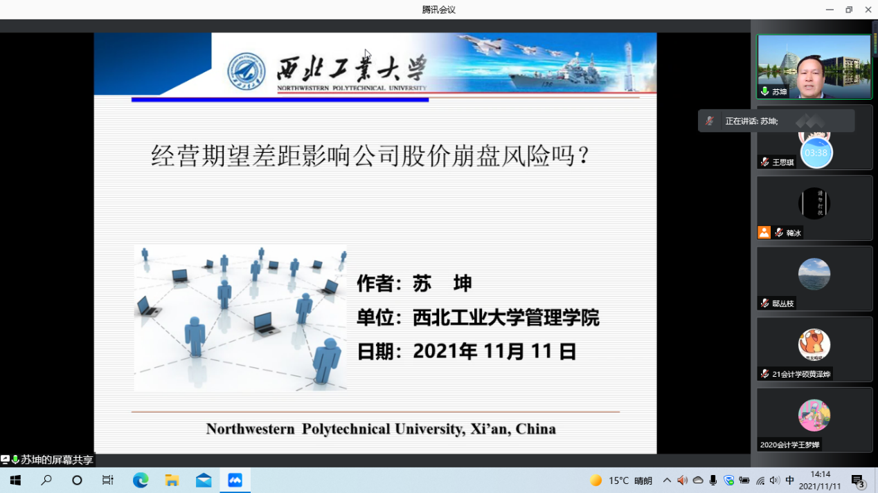 2021年11月11日下午,西北工业大学管理公司会计系苏坤教授应yl7703永利邀请,通过腾讯会议平台为同学们作题为《经营期望差距影响公司股价崩盘风险吗?》的报告。经理袁振兴、副经理李西文、邸丛枝老师、韩冰老师及yl7703永利20、21级研究生参加本次讲座。