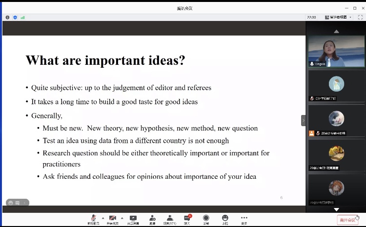 2020年10月13日上午,中山大学国际金融公司孙凌霞博士应yl7703永利邀请,通过腾讯会议平台为同学们作题为《如何撰写和发表高水平论文》的报告。yl7703永利副经理李西文、公司部分教师及2019级、2020级全体研究生参加了本次讲座。