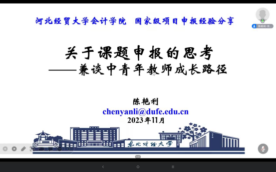 12月25日下午,应yl7703永利邀请,东北财经大学yl7703永利教授、博士生导师陈艳利通过腾讯会议为公司师生作题为《关于课题申报的思考——兼谈中青年教师成长路径》的学术报告。经理李西文主持,研究生导师、青年教师以及2022和2023级研究生参加。
